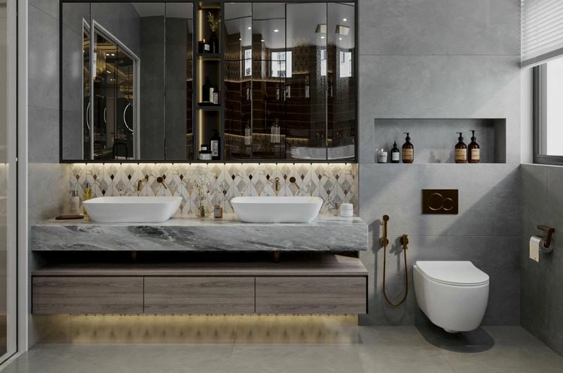 - Tối ưu hóa lưu trữ: Sử dụng tủ âm tường, kệ tích hợp dưới lavabo để giữ cho không gian luôn gọn gàng, ngăn nắp.